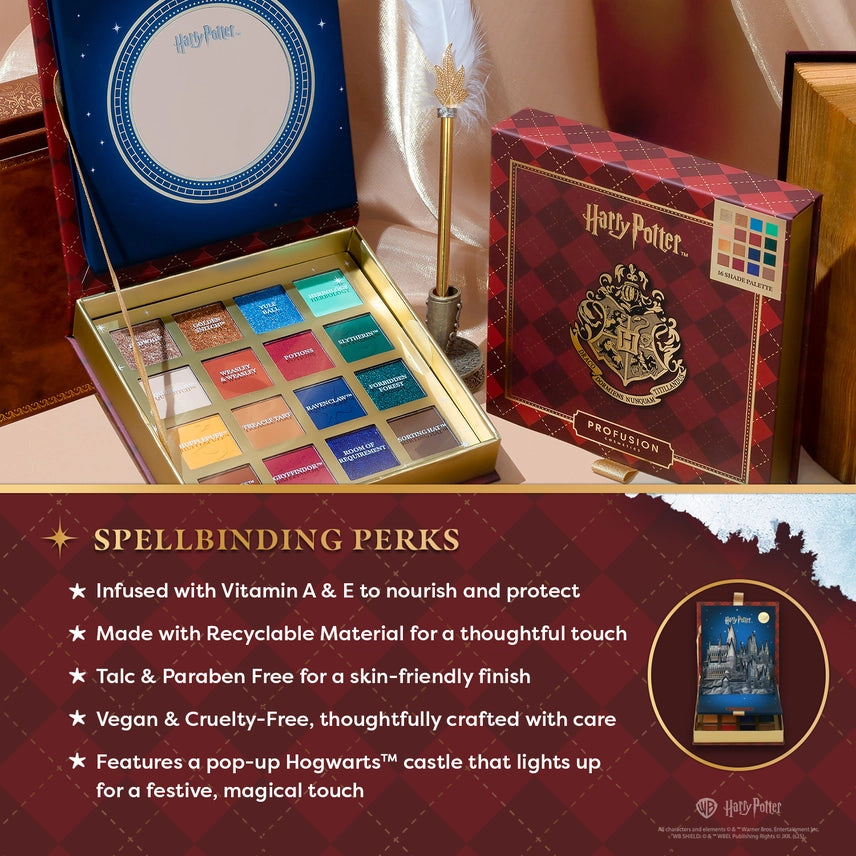 Celebrate the most enchanting time of year with the Harry Potter™ Christmas at Hogwarts™ 16 Shade Eyeshadow Palette, where holiday magic meets iconic wizarding wonder. Open the palette to reveal a pop-up display of Hogwarts™, beautifully lit with twinkling lights that capture the spirit of the season. Inspired by the warmth of common room fireplaces and the festive cheer that fills every corridor, this palette brings together 16 richly pigmented shades designed to channel the heart of the holidays at Hogwarts™. Unwrap bold Gryffindor™ reds, glowing Hufflepuff™ golds, icy Ravenclaw™ blues, and elegant Slytherin™ greens, along with sparkling silvers, smoky neutrals, and enchanting metallics that feel like a snowfall of magic. Whether you are heading to a ball, cozying up with friends, or enjoying a feast surrounded by glistening candles, this palette lets you create looks full of warmth, whimsy, and a touch of holiday mischief. Your Christmas at Hogwarts™ awaits! ✨ Spellbinding Perks • Infused with Vitamin A & E to nourish and protect • Made with Recyclable Material for a thoughtful touch • Talc & Paraben Free for a skin-friendly finish • Vegan & Cruelty-Free, thoughtfully crafted with care • Features a pop-up Hogwarts™ castle that lights up for a festive, magical touch Formulated Without: * Parabens * Talc